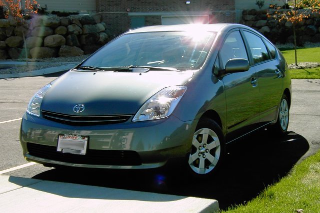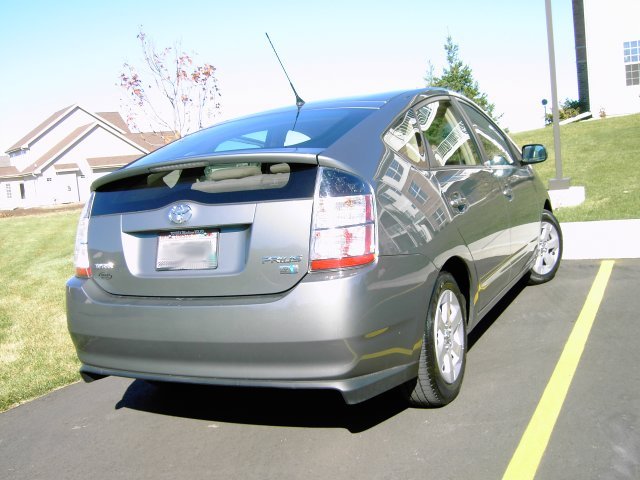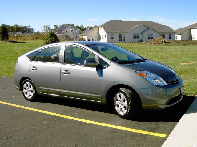 My new '04 Toyota PriusI just bought a new car, and I'm really stoked about it. It's a 2004 Toyota Prius. The Prius is a hybrid car. It uses both a gasoline engine and an electric motor. This gives the car unbelievable feul efficiency. The Prius is EPA rated to get 60mpg city/51mpg highway! (Edmunds.com spec sheet) I've read reviews about people who are mad because their Priuses are only getting 40-some mpg. Only 40-some!! That's still better than almost any other car out there! Even if I don't get 60, it's still a marked improvement over the T-Bird I used to drive. The last time I filled it up, I only managed 16.8 mpg. That made me very sad. It also pushed me to hurry up and get a new vehicle... that and the fact that the T-Bird really belonged to my father, it's power steering system had failed (so it was basically like driving without power steering), and the service engine soon light was starting to come on intermittently. Anyway... here's my new car.