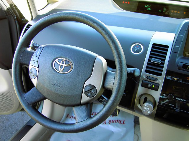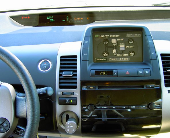 Let's start with the power button. That's right... a power button. It's that circle on the left side above the windshield wiper control. I put my key into the slot (kind of like loading a Nintendo cartridge), put my foot on the break, and press that button. The car turns on. The gas engine doesn't start (unless the battery is low and needs to be charged), all the electric gizmos just start up. At the top of the image you can see the spedometer, odometer, and all the miscellaneous stuff that is normally right behind the steering wheel. This is cool because now I don't have to look so far away from the road just to figure out how fast I'm going. Down and to the right, you can see what replaces the gear shift lever. To put it in park, I just push that rectangular button. The gearshift is a knob that I have to move about three inches, and let it snap back into place. It's all very nifty and easy to do. In the top, middle-right, you can see the LCD screen. Right now, it's showing the Energy Monitor. Nothing much is happening now (since the car is parked and not really on), but when you're driving, it shows which motor is actually pushing the car, whether the gas motor is on at all right now, and whether the battery is charging, driving, or doing nothing (like now). The wheels also turn while you're driving and stop when you stop. It's a touch screen, and the green rectangle in the bottom left corner of it is a button that takes you to a graph of your feul efficiency. The four buttons around the screen are Climate, Audio, Display, and Info. Climate brings up the climate controls: air conditioning, heating, etc. It features an auto mode that keeps the car at the temperature you specify. The Audio button brings up the radio or CD controls. It there are 16 FM presets and 8 AM ones. If the radio station supports it, the radio can display information like song title and artist name. The Display button turns the screen off (in case you like to watch all the stuff too much and it poses a driving risk). And the Info button brings up some configuration options. Below that, you have the clock, trip odometer reset, a switch for converting between miles and kilometers, the CD player and radio controls. Nothing too exciting there.